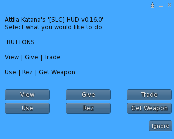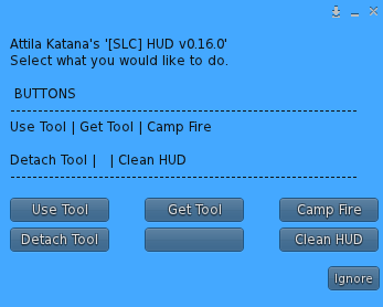 This button will show any tools which you own within your virtual inventory. If you have tools in your inventory and select one, it will tell a region server to send that tool to within the contents of your HUD. It will also delete one of the tools from your virtual inventory.